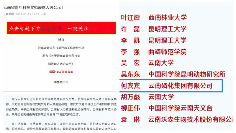 近日,云南省青年科技獎評選工作領導小組發布了《關于云南省青年科技獎擬表彰人選的公示》,公司研發中心磷化工團隊負責人何賓賓擬獲得“云南省青年科技獎”榮譽。